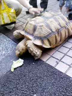 飼い主さんとゆっくりお散歩していたゾウガメ君。