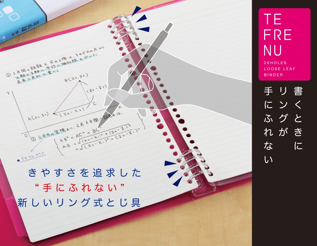 手が触れやすい真ん中の位置のリングを取っ払い、リングを上下に分けて配置することで問題を解決。利き手と反対側のぺージに文字を書くときでも手がリングに触れることなく、快適に書き込みができる。