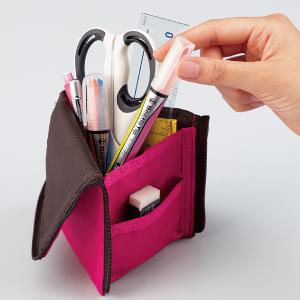 こちらは爆発的ヒットを記録した定番モデル「ネオクリッツ」をさらに使いやすく進化させたモデルで、「ネオクリッツ」と同様に一般的なペンを15本収納しながら、ぺンケース本体の厚さは約40%オフ。トレンドのマチの薄いバッグやクラッチケースにもすっきり収まる。ファスナーを開いて上半分を折り返せば、ぺンスタンドとして机の上に置くことができるので、机の上にぺンが散らかることもない。この使いやすさが人気の秘密なのだ!
