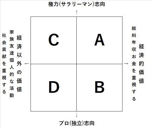 上部は、組織的な力を志向する「権力志向」です。サラリーマン的な志向ですね。企業や組織内で昇進し、予算や人事権を得て権力を掌中にしたいなら上に行くべきです。けっして悪い意味ではありません。組織とともに自己実現する生き方です。それに対して下部は、個人的な力の充実を志向する「プロ志向」です。技術志向とも職人志向とも言えるでしょう。組織を離れて個人になっても、働き続ける志向性です。